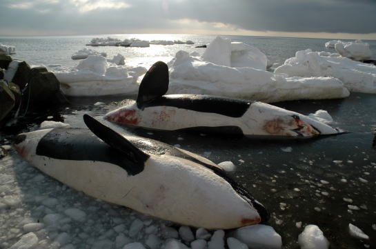 ABSTRACTS OF THE PAPERS Presented at the 16th Congress of The Sea of Japan Cetology Research Group ![]() PHOTOGRPH Two adult female killer whales in a pod caught in a jam of broken ice, and died on the coast of Aidomari, Rausu Town, Hokkaido. Taken on February 9, 2005. Courtesy by Mr. Yoshikazu Uni, UNIS (Uni's office of Nature-human Interaction Studies). At Hakodate Kokusai Hotel Hakodate June 25-26, 2005 |
