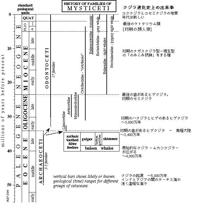 万年以上前には現れており,ナガスクジラ様の動物は1,500 万年前までにはたぶん進化していた。中新世の終わりまでには,つまりはヒトの祖先が直立歩行をするもっとずっと以前に,ヒゲクジラは現生種のものと構造的に近かったのである。最近の500