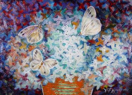 「縞模様の花器にいけられた紫陽花と三匹の蝶」