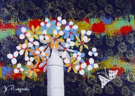 コラージュ「白いビンにいけられた花と一匹の蝶」