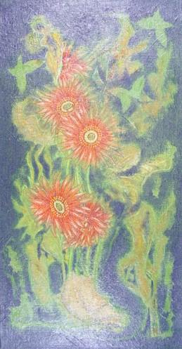 「赤いガーベラ、枯れ向日葵と三匹の蝶」